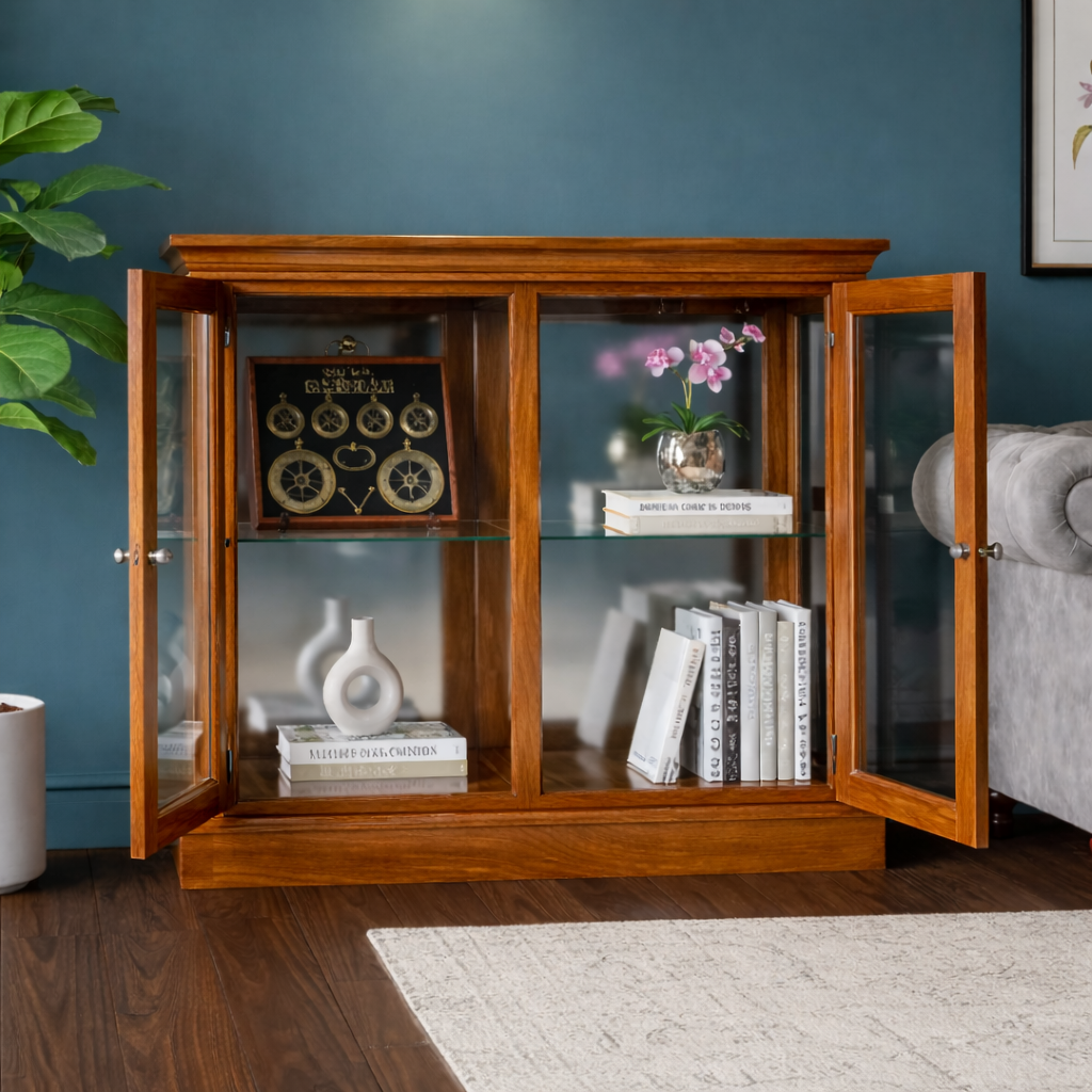Dua pintu kaca transparan pada bagian depan memungkinkan koleksi di dalam lemari terlihat jelas tanpa kehilangan perlindungan dari debu dan kotoran. Desain ini sangat ideal untuk menampilkan barang dekoratif seperti vas, koleksi antik, buku pilihan, keramik, atau aksesoris interior lainnya. Dengan tampilan yang rapi dan bersih, lemari ini membantu menciptakan fokus visual yang menarik di ruang tamu, ruang keluarga, maupun ruang kerja.