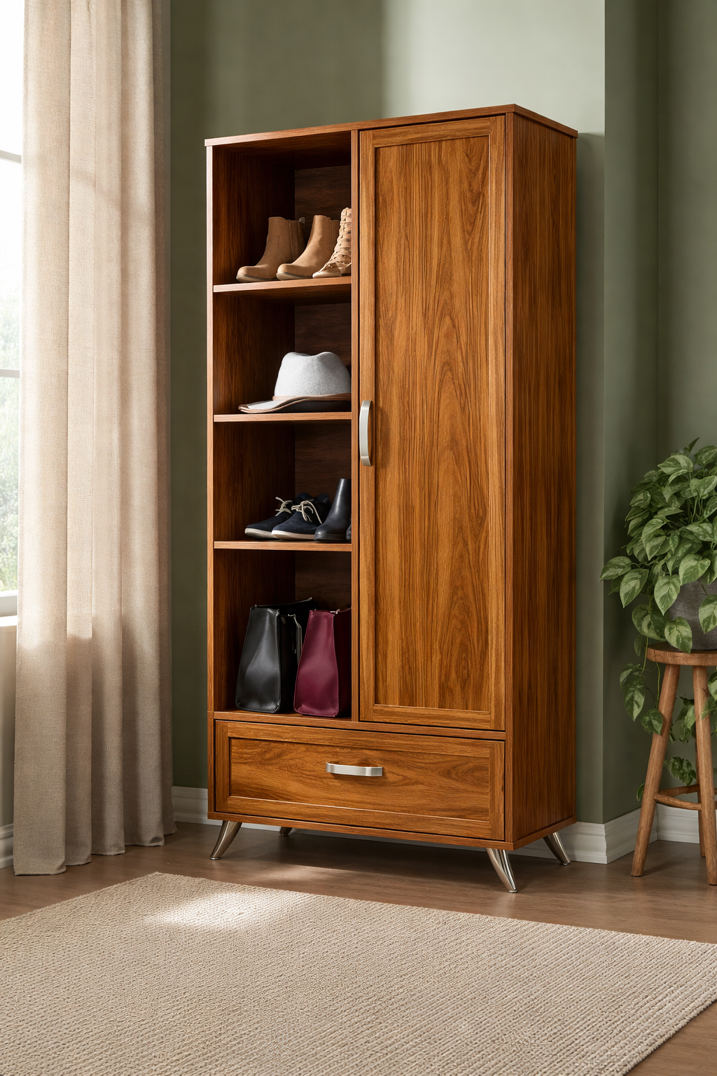 Struktur lemari dibuat dengan desain tegak dan ramping, sehingga ideal ditempatkan di area terbatas seperti dekat pintu masuk, kamar tidur, atau ruang ganti. Kombinasi rak terbuka dan pintu tertutup memungkinkan Anda menyimpan sepatu dengan lebih terorganisir. Rak terbuka memudahkan akses cepat untuk sepatu yang sering digunakan, sementara bagian tertutup menjaga sepatu tetap terlindung dari debu dan tampak lebih rapi.