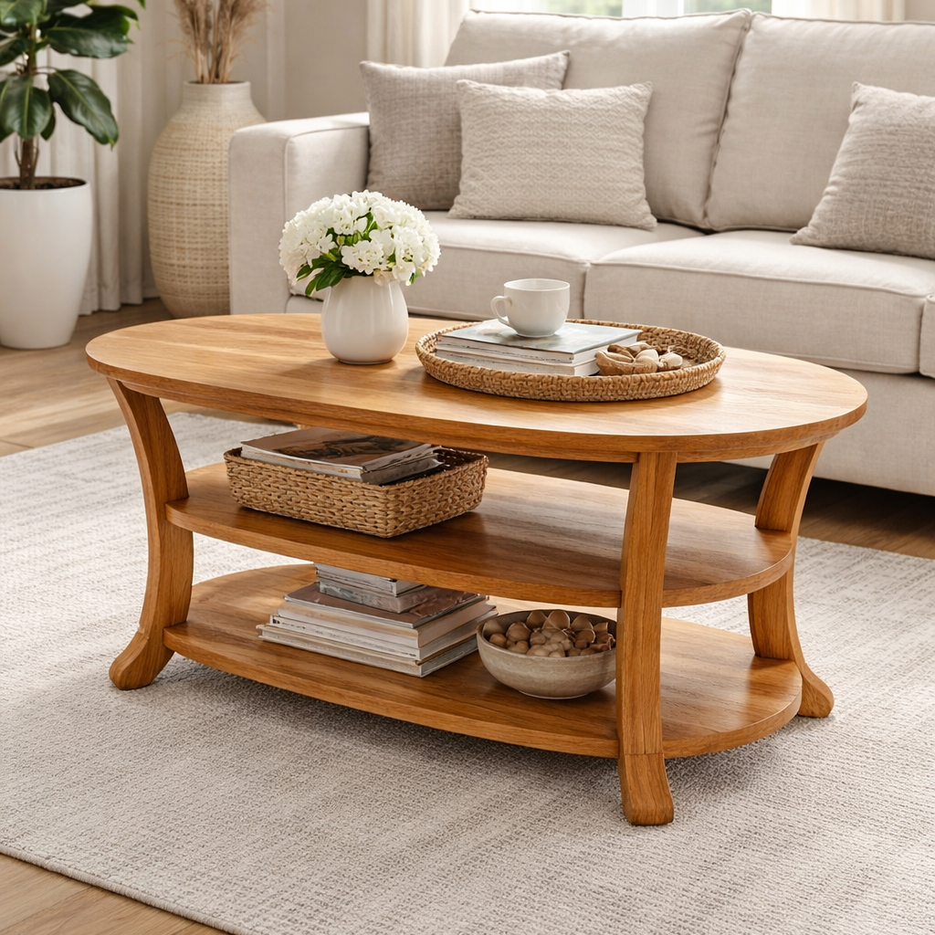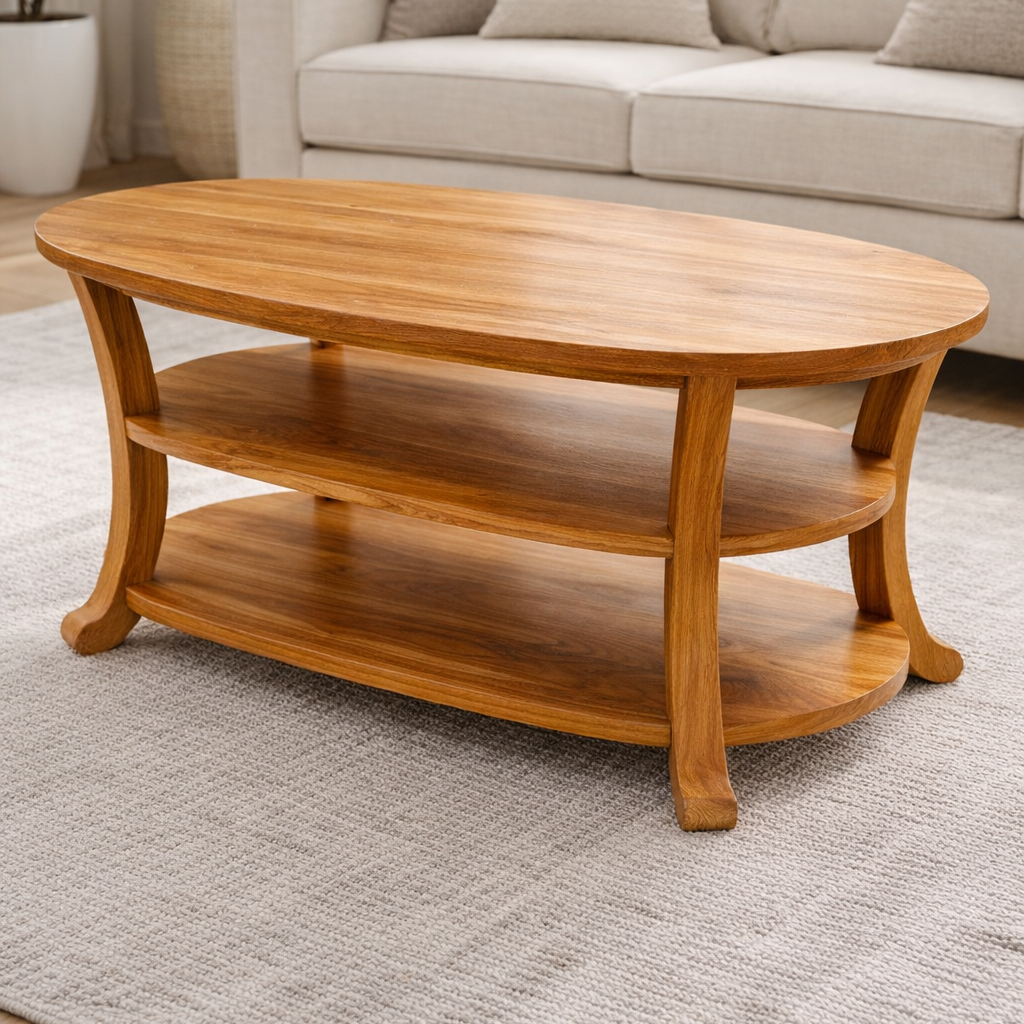 Meja tamu jati oval bertingkat laci ini merupakan pilihan ideal bagi Anda yang menginginkan perpaduan antara fungsi, estetika, dan kualitas material premium untuk melengkapi ruang tamu. Dibuat dari kayu jati solid pilihan, meja ini menampilkan karakter kayu yang kokoh, serat alami yang indah, serta warna khas jati yang hangat. Finishing natural kayu jati dengan sentuhan glossy halus membuat permukaan meja tampak elegan, bersih, dan berkelas tanpa menghilangkan keindahan alami kayu.